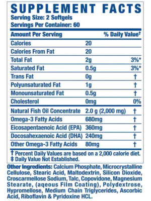 | Valores nutricionales por porción | DHA (ácido docosahexaenoico) 300 mg,EPA (ácido eicosapentaenoico) 400 mg,Omega 3 800mg,Vitamina E 2 miligramos |